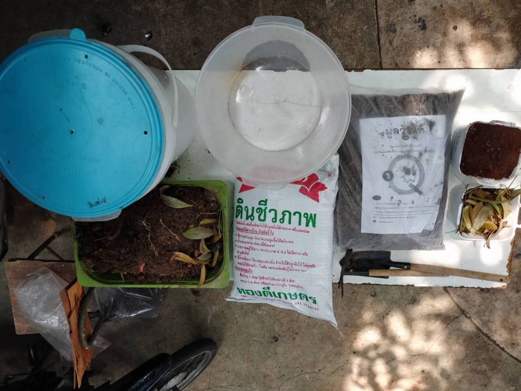 You can use a sack or a bucket. Composting in a sack is cheap, and makes the process easy with its ventilative quality. Put an old sack, like a rice sack, in a basket. Put a little starter in the bottom, add ingredients in making layers of brown and green matter, and add more starter at the top. Close it tight when it’s full, tie it up, and let it work. If the ingredients are too dry, sprinkle a little water. Keep liquids, soups, and curries out of the mix. If you use a bucket, make some holes in the bucket to allow ventilation, and leave a tray under the bucket to capture any moisture. The process is the same.