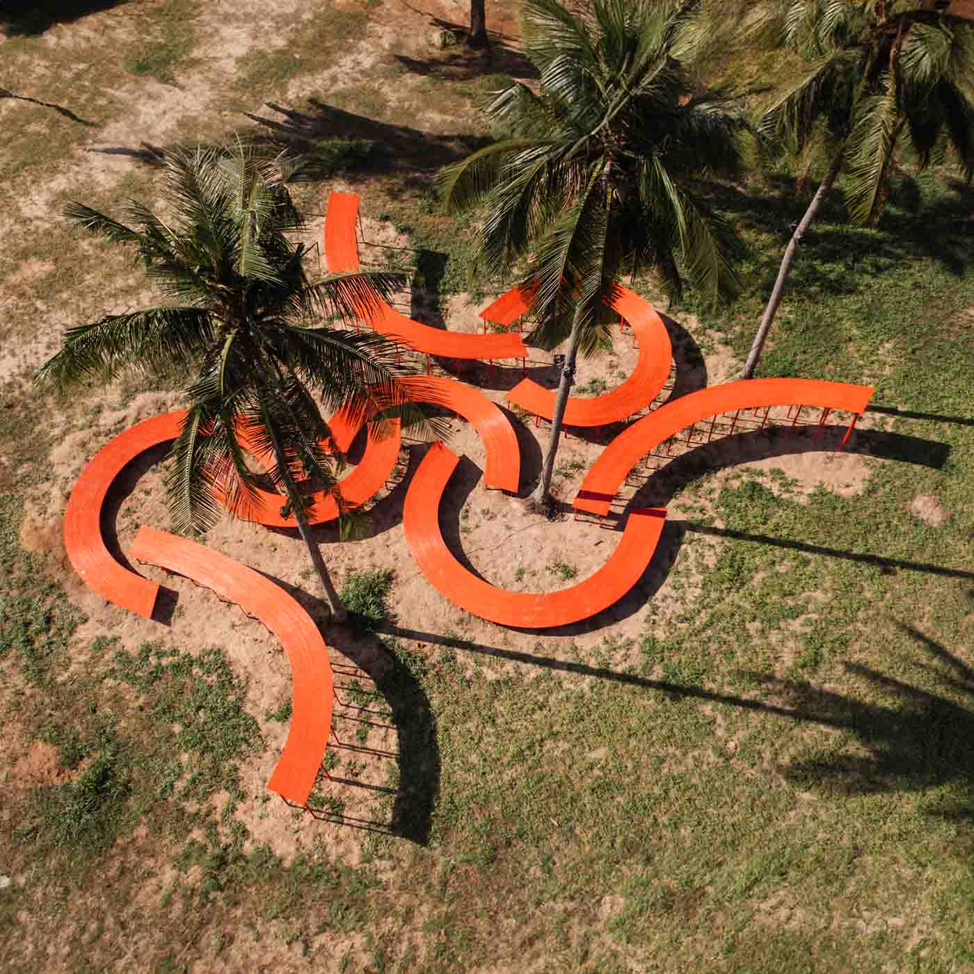 Although innocuous, a shift in elevation has an effect on how we behave and how we feel. The modular, curving shapes of ‘The Walk’ by Boonserm Premthada have become an iconic landmark. A brilliantly colored, floating walkway, it encourages both motion and stillness, attracting people of all ages at different times of day. It reframes the grass beneath and the coconut trees that stand around it, allowing us to view The Fields from new vantage points.