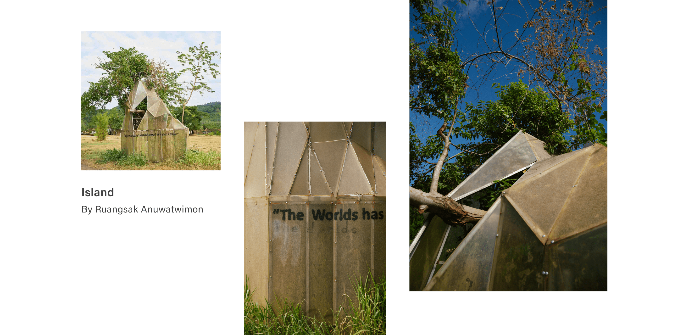 When first introduced in 2018, the installations of ‘Island’ by Ruangsak Anuwatwimon were alienated from the tropical space around it. Growths within sculptural structures harvest moisture released from the ground, creating micro ecologies inside. Through time, Ruangsak’s work has effectively rewilded itself. Last year, one of the trees that sprouted through the artwork from inside had its branches snapped in a tropical storm, shattering part of the structure and leaving an opening for the branch to heal and resprout.